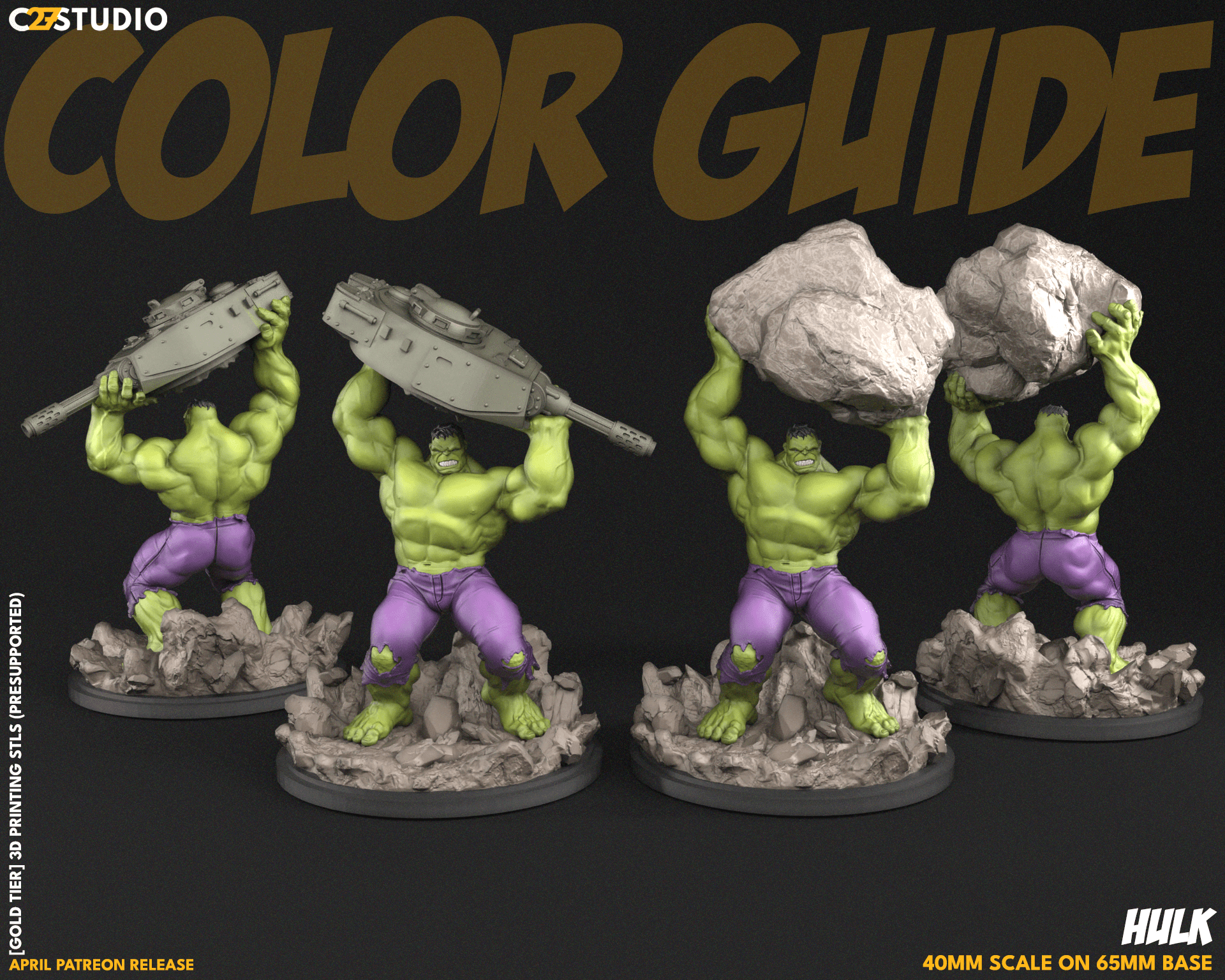 Our 3D printing STL 40mm scale Green Smash (2 Versions) on 65mm base comes with pre-supported files. Ideal for resin printers.